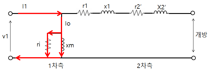 2차측이 개방되면 개방된 쪽으로는 전류가 흐르지 못하고 위와 같은 전류의 흐름을 띄게 된다.