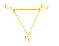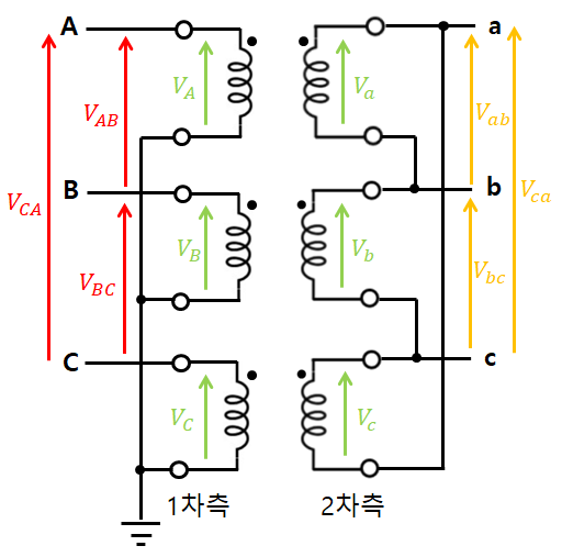 2차측은 선간전압이 V(ab),V(bc),V(ca)가 된다. 2차측은 1차측의 V(A),V(B),V(C)가 V(a),V(b),V(c)로 그대로 넘어오게 되고 이 둘은 동상이다. 그리고 V(a),V(b),V(c) 자체가 선간전압이므로 V(ab),V(bc),V(ca)와 같다.
