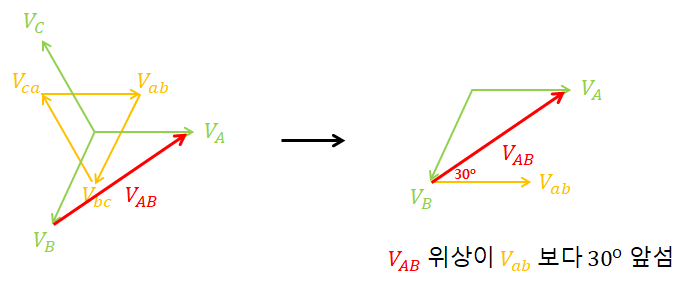 1차측 선간전압과 2차측 선간전압을 비교하기 위해 두 페이저도를 합쳐보았다. V(ab)를 V(AB) 쪽으로 내려서 확인해보면 위상차이가 30º 나는 것을 확인할 수 있다. 페이저도에서 각도는 반시계방향으로 증가하므로 V(AB)가 V(ab) 보다 위상이 30º 앞섬을 알 수 있다.