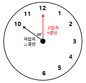Yd1 : 고압측 Y(와이)결선, 저압측 △(델타)결선 (고압측과 저압측의 위상차이 30˚ -고압이 30˚ 앞섬)