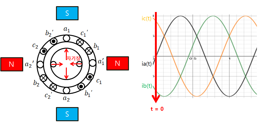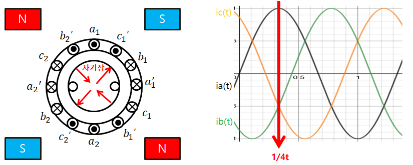 - 4/4주기는 전기각의 360º 변화이다. 이 때 t=0일 때와 비교하여 자기장의 방향이 360º 변한 걸 확인할 수 있다.