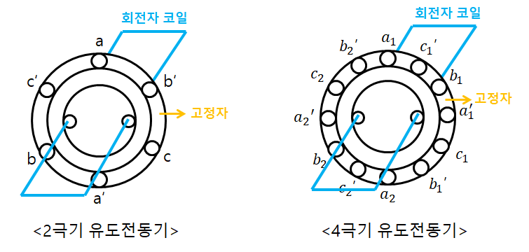 2극기와 4극기 유도전동기를 간단히 나타낸 모습. 고정자에 3상교류전류를 공급하면 회전자계가 형성되고 회전자 코일에 유도전류가 형성되어 코일이 회전하게 된다.
