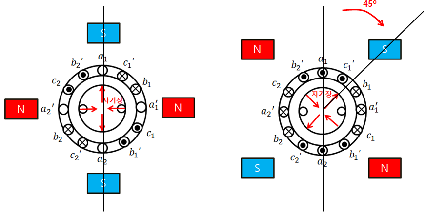 전기각은 0º에서 90º로 증가했지만 회전자계(기계각)는 45º밖에 변하지 않은 것을 확인할 수 있다.