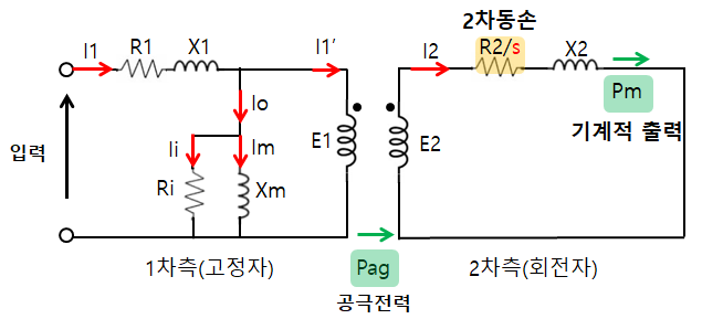 공극전력 : 2차동손 : 기계적출력 = 1 : s : (1-s) 로 표현할 수 있다.
