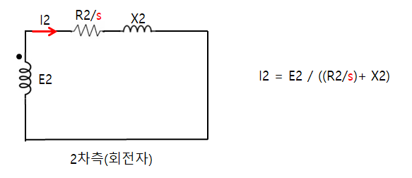 회전자 등가회로에서 전류는 옴의 법칙(I = V/R)에 의해 구할 수 있다. I2 = sE2 / (R2 + jsX2)이다.