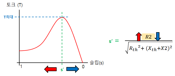 R2가 작아지면 슬립 s'값이 작아져서 그래프에서 토크의 최대값이 오른쪽으로 가게 된다.