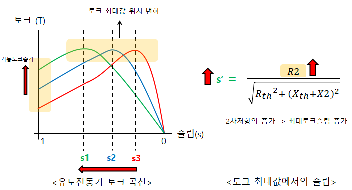 공식을 보면 알겠지만 2차측 회전자 권선의 저항(R2)가 증가할수록 토크 최대값을 나타내는 슬립(s')이 증가함을 알 수 있다.