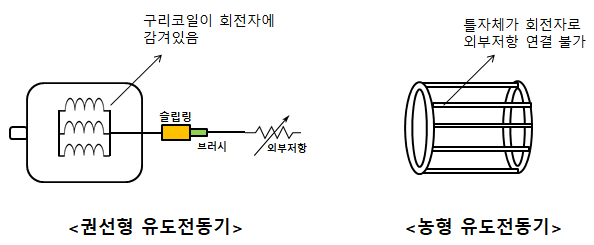 형태를 보면 권선형 유도전동기는 구리코일이 직접 회전자에 감겨있는 형태이고, 농형 유도전동기의 경우는 틀 자체를 회전자 코일로 사용함을 볼 수 있다.